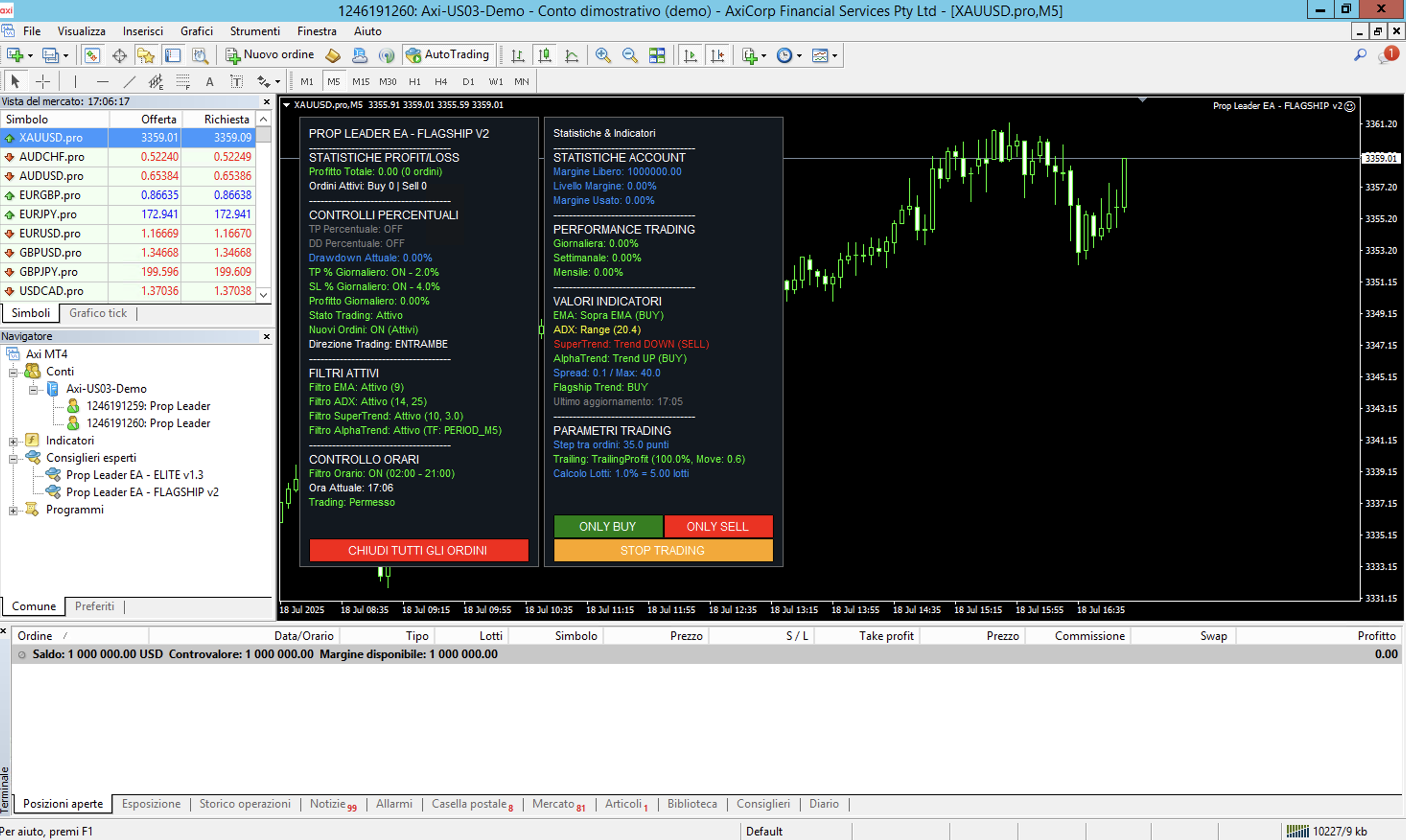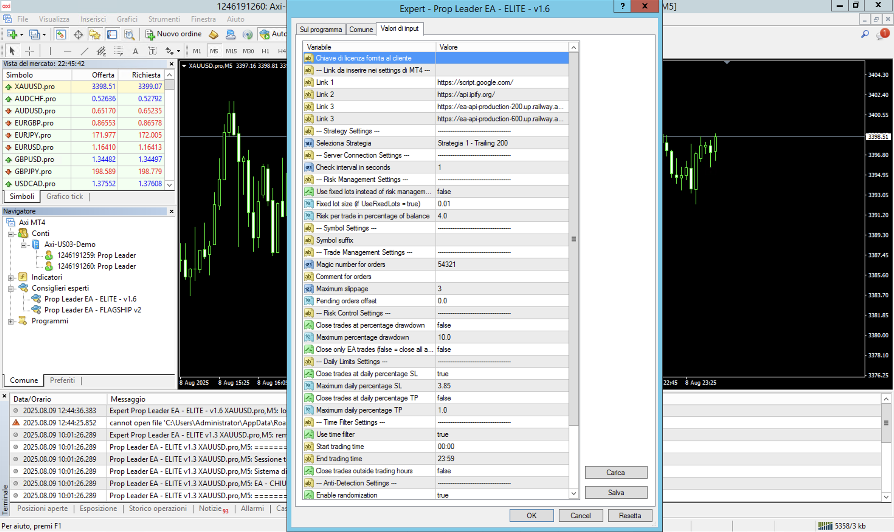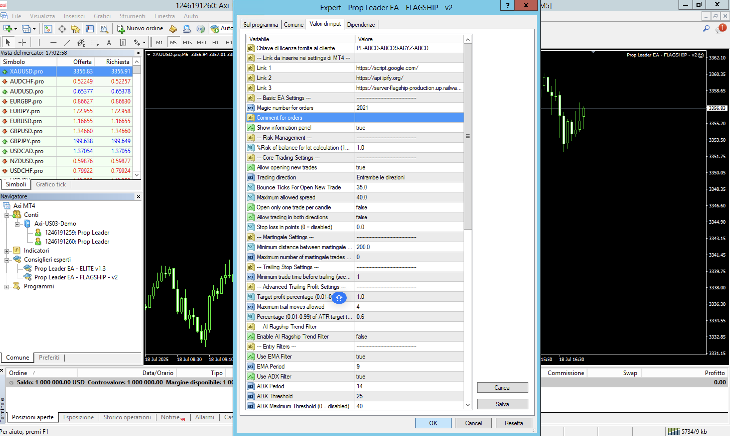 Se non si ha la possibilità di usare conti di questo tipo perchè ad esempio si opera su Prop Firm, consigliamo di eseguire il BOT su un conto demo di un broker con basso spread e poi copiare i trades sul conto Prop Firm.