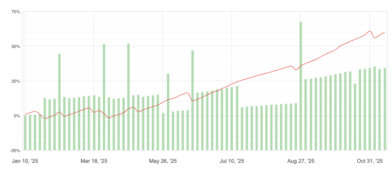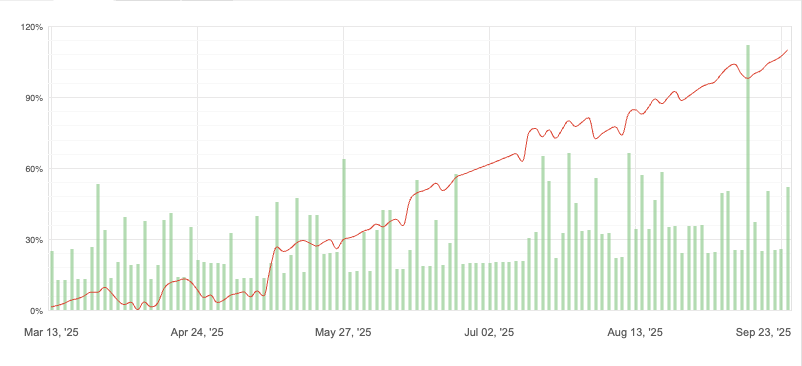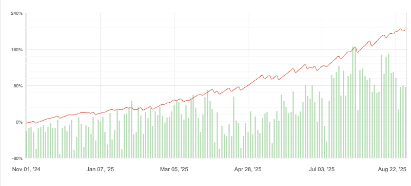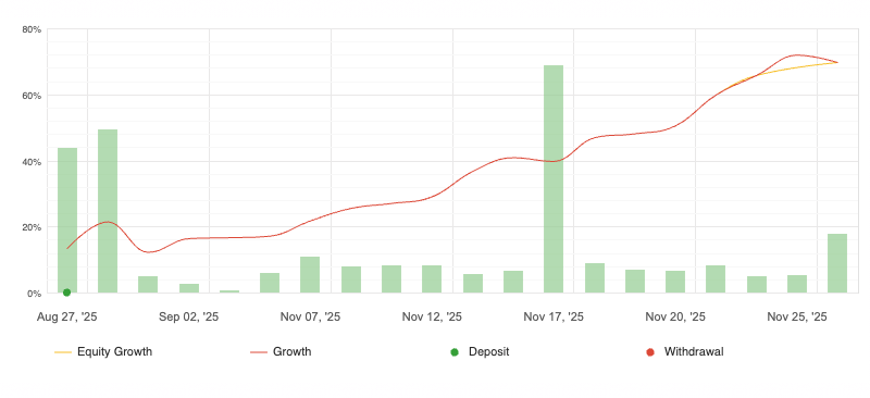 Di conseguenza, il Drawdown (DD) che vedrai qui potrebbe essere più alto rispetto a quello che avrai tu su un tuo conto personale (Prop o Real) con una gestione del rischio standard. Noi lo facciamo perché conosciamo a fondo la sinergia dei nostri algoritmi e possiamo gestire questo livello di rischio cumulativo.